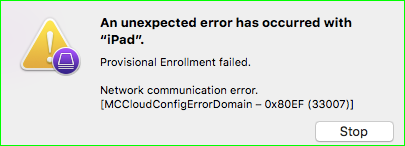 Apple Configurator 2 was showing following error message: Provisional Enrollment failed. Network Communication error MCCloudConfigErrorDomain – 0x80EF (33007), The Error screenshot is shown below.